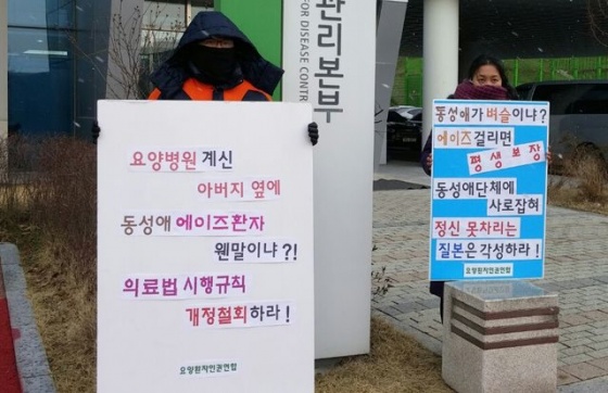 전국 요양병원 입원환자들의 보호자 모임인 요양환자인권연합은 최근 질병관리본부 앞에서 1인 시위를 하며 에이즈환자 입원법에 반발했다.