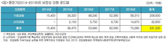 또한 급성기 질환에서 당뇨나 고혈압 등의 만성질환 위주로 질병구조가 변화고 노인진료비가 2014년 35.8% 수준에서 2020년 45.6%로 급증할 것으로 예측돼 지속가능한 건강보험을 만들기 어렵다는 것이다.