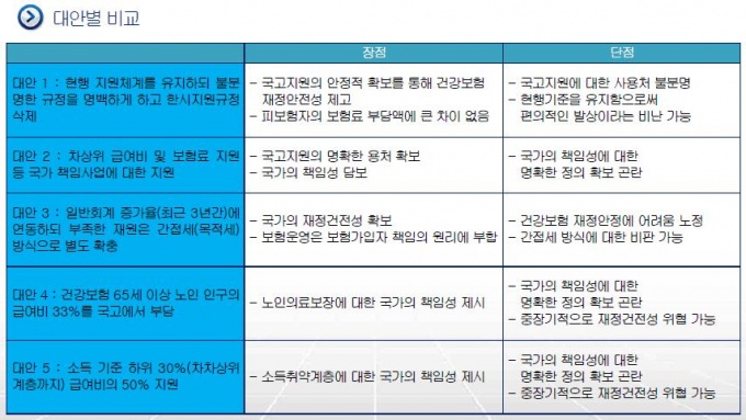 네 번째는 건강보험 33% 규모에 달하는 65세 이상 노인급여비를 국고에서 부담하는 형태다. 급증하는 노인의료비와 의료보장에 대한 부분을 명확히 할 수 있지만 중장기적으로 재정 건전성을 위협하는 요인도 상존하는 문제가 존재한다.