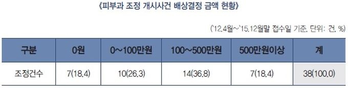 조정 개시된 사건 중 의사나 병원의 배상책임이 인정된 경우는 500만원 이하가 31건으로 가장 많았다. 비율로는 81.6%에 달하다. 즉 10건 중 8건은 500만원도 받지 못한다는 얘기다.