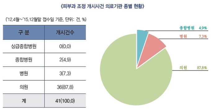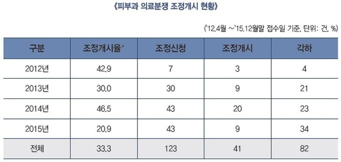 한국의료분쟁조정중재원에 따르면 지난 4년 간 피부과와 관련한 상담건수는 2012년 209건, 2013년 340건, 2014년 320건, 2015년 270건이 이뤄졌다.