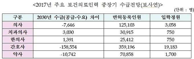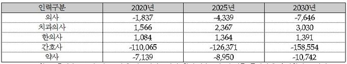 연구결과에 따르면 2030년이 되면 의사는 7600명, 간호사는 15만8000명, 약사는 1만명이 부족하고, 치과의사는 3000명, 한의사는 1400명이 과잉 공급되는 것으로 추계됐다.