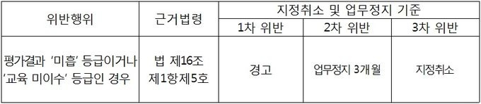특히 1회 미흡의 경우 경고, 2회 연속 ‘업무정지 3개월’, 3회 연속 ‘지정취소’ 처분을 받는 이른 바 삼진아웃제가 전격 도입된다.