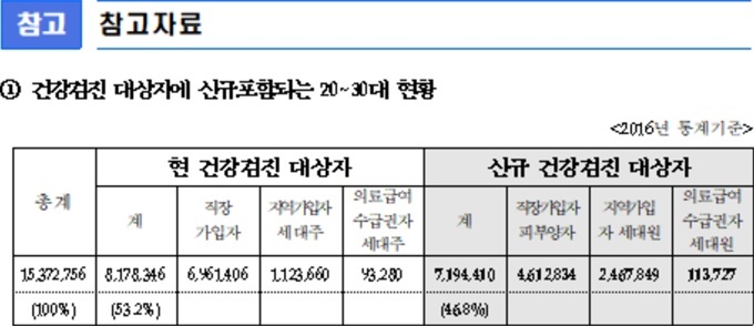 그동안 20~30대 직장가입자 및 지역가입자 세대주는 건강검진 대상으로 주기적인 건강검진 혜택을 받아 왔으나, 20~30대 중 취업준비생·가정주부 등 피부양자 및 세대원 등은 대상에서 제외돼 형평성 문제가 제기됐다.