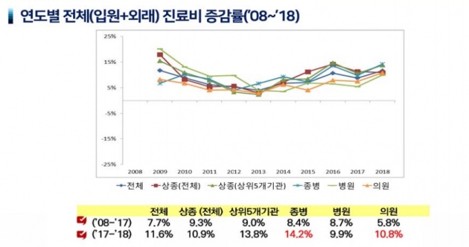 이 기간 전체 외래 진료비는 11.4%가 올랐고 입원 진료비는 11.9% 증가했다. 상급종합병원 외래 및 입원 진료비는 평균보다 낮은 11.2%, 10.8%로 집계됐다. 반면 종합병원급은 12.3%, 15.2%로 상급종병 대비 증가율이 가팔랐다.