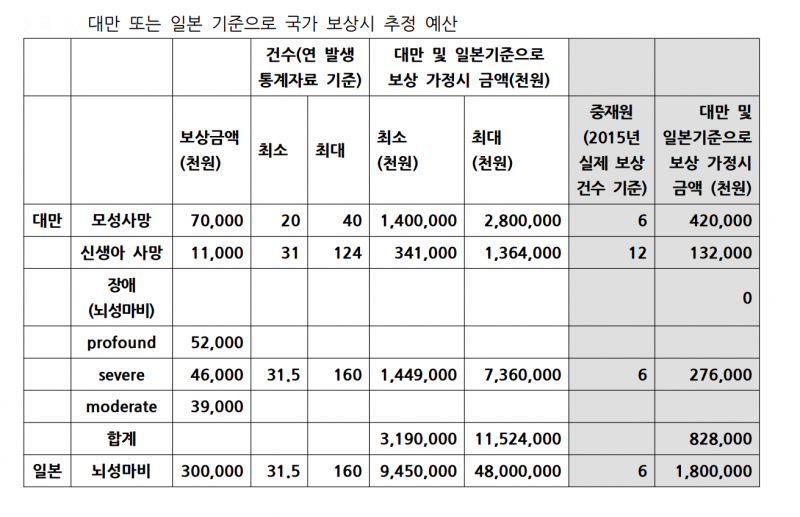 또한 "우리나라 통계를 바탕으로 직접 모성사망 건수를 최대로 잡으면 평균 40건으로, 대만과 동일한 액수를 지급한다고 가정했을 때 연간 소요액은 28억 원 정도"라며 "수조원이 넘는 예산을 운영하는 서울시에서는 상대적으로 낮은 수준"이라고 밝혔다.
