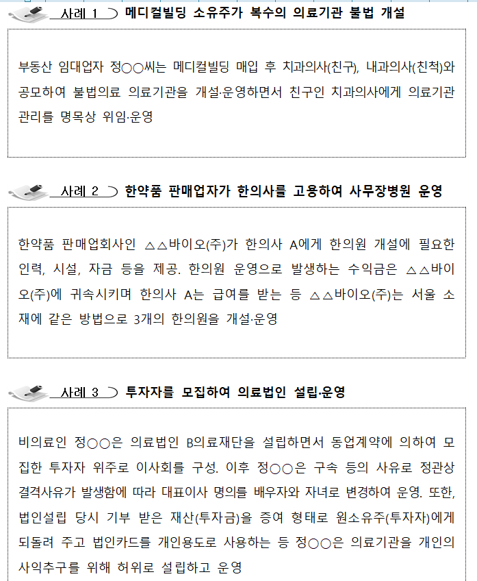대표적인 적발 사례로 비의료인이 의사와 공모해 의료기관을 개설‧운영하거나 의약품 판매업자로부터 인력, 시설, 자금을 제공받아 의료기관을 개설·운영하는 등 다양한 수법으로 사무장병원을 운영하고 있었다.