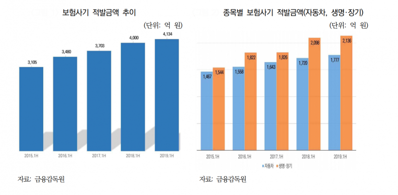 이 보고서에 따르면 2015년 이후 생명 및 장기손해보험 관련 보험사기 적발금액이 자동차보험 관련 보험사기 적발금액보다 빠른 속도로 증가하고 있다.