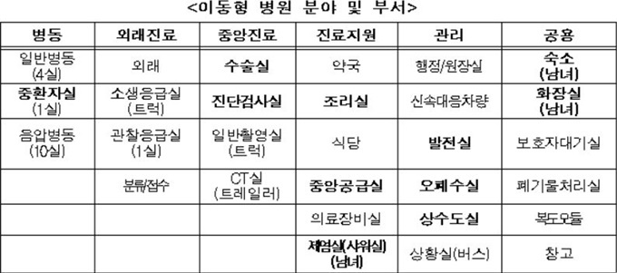 이동형 병원이란 신종 코로나바이러스를 비롯한 감염병이 아닌 세월호 침몰 등 재난현장에서 의료서비스를 제공하기 위해 도입한 것으로, 응급실 운영 및 외과 수술·중환자 감시 등이 가능하다.
