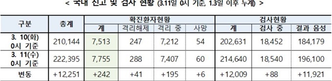 질병관리본부 중앙방역대책본부(중대본)은 11일 0시 기준 총 누적 확진자 수가 7755명이 됐다고 밝혔다. 전날 0시 기준 513명보다 242명 증가한 것이다.