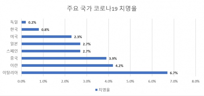 반면, 확진자가 대거 발생한 주요 국가들 중 우리나라는 치사율이 0.8%(7979명 확진자 중 67명 사망)로 독일(0.2%)에 이어 가장 낮다. 3.6%인 세계 평균에 비해서는 4분의 1 수준이다.