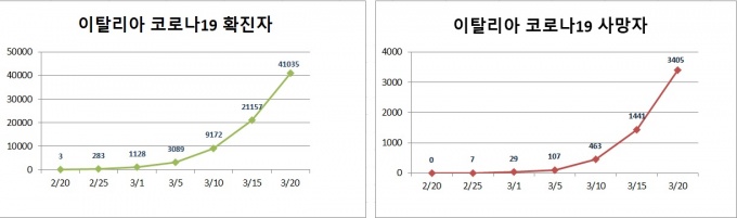 이탈리아는 지난 1월 31일 첫 확진자가 발생한 후 지난달 20일까지 확진자 3명을 유지하다가 21일부터 급격하게 증가해 최근 연일 3000명 안팎의 확진자가 발생했다.