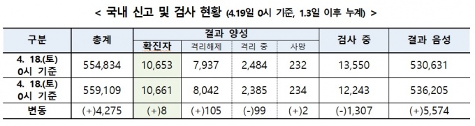 사망자는 2명 늘어 총 234명이 됐다. 격리해제된 확진자는 105명 증가한 8042명이었다. 연일 완치자가 신규 확진자보다 많이 나와 격리 중인 확진자 역시 감소세를 보이고 있다.