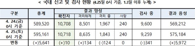 질병관리본부 중앙방역대책본부(중대본)은 25일 0시 기준 신규 확진자는 10명이고, 총 누적 확진자 수는 1만 718명이라고 밝혔다.