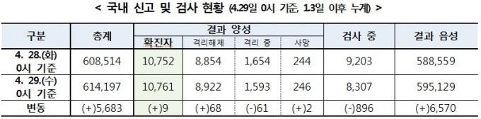 중앙방역대책본부(방대본)는 29일 0시 기준 코로나19 확진자는 9명 증가한 1만761명이라고 밝혔다.