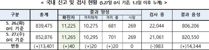 질병관리본부 중앙방역대책본부(중대본)은 27일 0시 기준 신규 확진자가 40명 발생, 총 누적 확진자수는 1만 1265명이 됐다고 밝혔다.