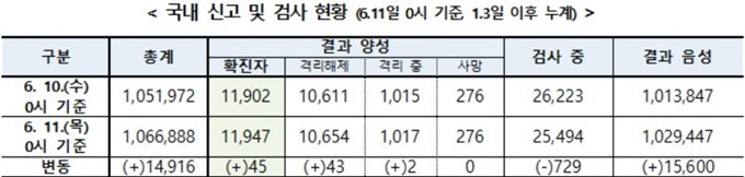 질병관리본부 중앙방역대책본부(중대본)은 11일 0시 기준 코로나19 신규 확진자가 45명 발생해 총 누적 확진자 수가 1만1947명으로 집계됐다고 밝혔다.