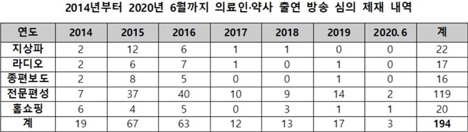 김상희 의원에에 따르면 지난 2014년부터 올해 6월까지 의료인·약사 등이 방송 또는 홈쇼핑에 나와 잘못된 의료정보 제공, 허위 과대광고, 병원 홍보 등으로 방송심의 제재를 받은 경우는 총 194건에 달했다.