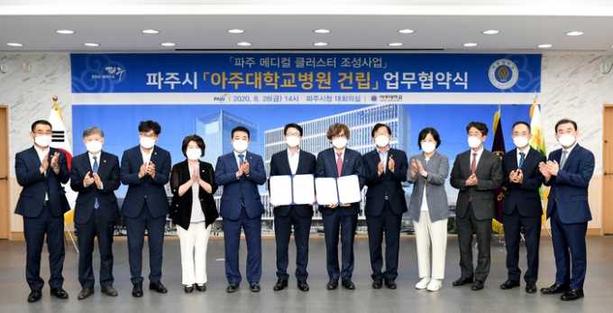 파주시와 아주대병원은 지난 8월28일 최종환 파주시장과 박형주 아주대학교총장을 비롯해 주요 관계자들이 참석한 가운데 파주시청 대회의실에서 파주메디컬클러스터 내 아주대병원 건립 내용의 업무협약을 체결했다.