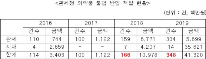 특히 지난해 의약품 불법 반입 적발건수는 약 350건에 육박하고, 액수도 네 배 가까이 증가한 것으로 확인됐다.