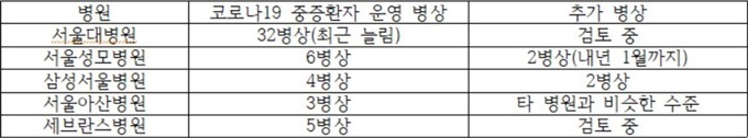 서울성모병원은 내년 1월까지 2병상을 더해 총 8병상, 삼성서울병원도 2병상을 추가해 6병상, 현재 3병상을 운영 중인 서울아산병원은 타 병원과 비슷한 수준으로 코로나19 중증환자 병상을 늘릴 계획이다.