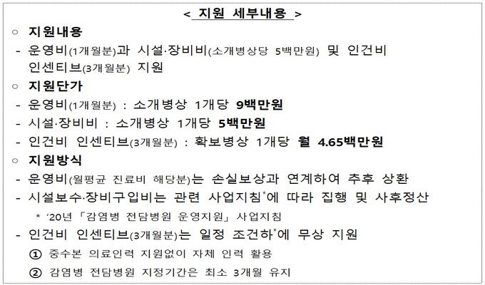 지원내용을 살펴보면 운영비(1개월)와 시설‧장비비(소개병상당 500만원) 및 인건비, 인센티브(3개월분) 등이 포함된다.