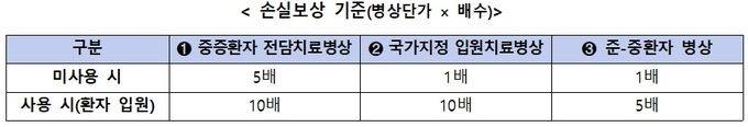 중증환자 전담치료병상의 경우 해당 병원 병상단가 대비 5배(미사용시), 10배(사용시)를 보상한다. 국가지정 입원 치료병상도 미사용시 1배, 사용시 10배 보상이 이뤄진다.