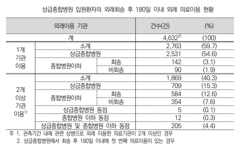 특히 외래회송의 경우가 상급종합병원을 이용한 비율이 높았다. 상급종합병원에서 입원하고 외래회송된 환자의 약 70%가 180일 동안 상급종합병원을 주로 이용했으며, 상급종합병원에서 외래를 이용하고 외래회송된 환자의 41.5%가 또 다시 상급종합병원을 이용했다.