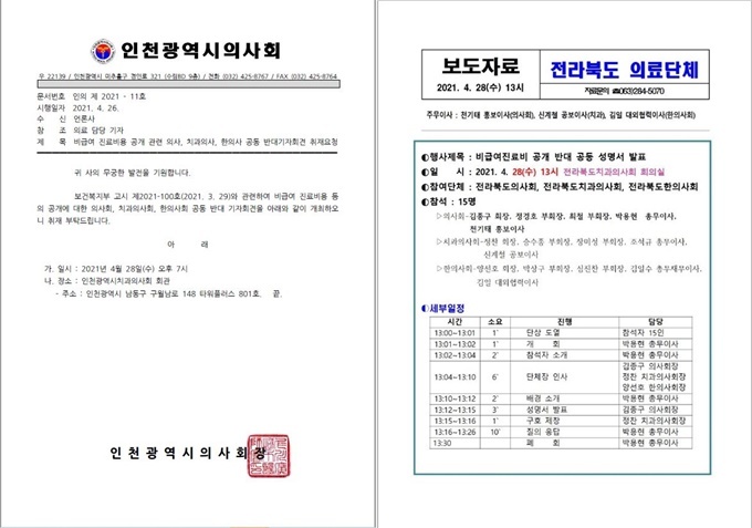 16개 시도의사회와 마찬가지로 16개 치과의사회, 한의사회 등이 함께 모여 날짜·시간 등을 맞춰 비급여 고지 의무화에 대한 비판 성명을 내는 형식은 대동소이하다. 단, 전라북도의사회 등의 경우 오후 1시에 성명서를 발표한다.