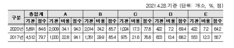 정기평가 실시기관 중 최우수(A등급) 기관은 2009개소(34.1%), 우수(B등급) 기관은 2014개소(34.2%), 최하위(E등급) 기관은 422개소(7.2%)로 평가됐다.
