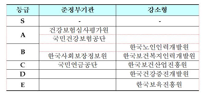 이번 평가 범주에 속하는 공공기관 가운데 B등급을 받은 곳은 준정부기관인 한국사회보장정보원을 비롯해 한국노인인력개발원, 한국보건복지인력개발원 등이며 국민연금공단과 한국보건산업진흥원은 C등급을 받았다.
