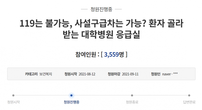 최근 청와대 국민청원 게시판에는 ‘119는 불가능, 사설구급차는 가능? 환자 골라받는 대학병원 응급실’이라는 제목의 청원글이 게재됐다.