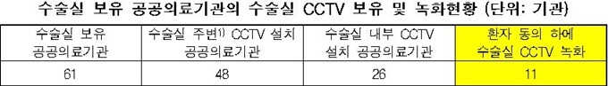 세부적으로 공공의료기관 61곳 중 입구, 복도 등 수술실 주변에 CCTV를 설치한 공공의료기관은 48곳이었고, 수술실 내부에 CCTV를 설치한 의료기관은 26곳이었다.