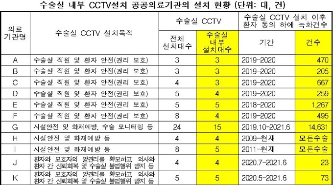 특히 수술실 내 CCTV를 보유하고 있는 공공의료기관 26곳 중 환자 동의하에 수술실 내부 CCTV 녹화가 이뤄진 기관은 11곳이다.