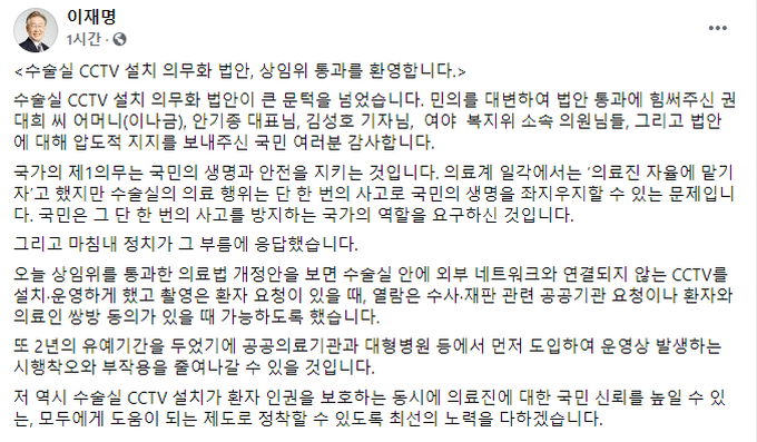 [데일리메디 박대진 기자] 이재명 경기지사가 수술실 CCTV 설치 의무화법의 국회 보건복지위원회 통과에 대해 “마침내 정치가 그 부름에 응답했다”며 환영을 표했다.