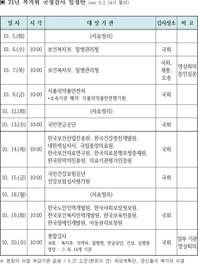 같은 달 20일에는 보건복지부·식약처·질병청·건보공단·심평원 등이 국회에 참석한 가운데, 이외 14개 기관에 대해서는 영상을 통해 종합감사가 진행된다.
