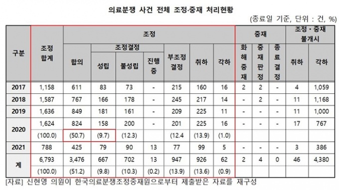 국회 보건복지위 신현영 의원(더불어민주당)은 최근 한국의료분쟁조정중재원으로부터 제출받은 자료 분석 결과, 지난해 자동개시 의료분쟁사건 중 절반(49.0%)만 조정 및 합의가 이뤄지고 있는 것으로 확인됐다고 29일 발표했다. 이는 같은 기간 일반 의료분쟁조정 사건의 60.4%에 비해 11.4%p 낮은 비율이다.