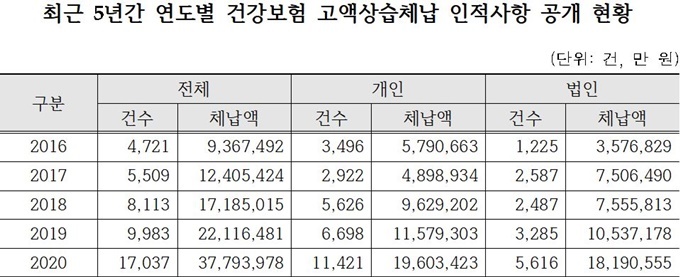 1일 국회 보건복지위원회 서영석 더불어민주당 의원이 건강보험공단으로부터 제출 받은 자료에 따르면 지난해 말 기준 인적사항이 공개된 고액 상습 체납건수는 1만7037건, 체납액은 3779억원에 달했다.