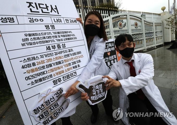 길벗 한의사모임 회원들이 10일 정부서울청사 앞에서 '세계 정신건강의 날, 청년 고독사 문제 해결을 위한 보건·의료계 공동행동 선포 기자회견'에서 청년 고독사에 대해 국가가 책임질 것을 촉구하고 있다. <사진제공=연합뉴스>