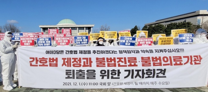 또한 신 회장은 간호법 제정이 불법진료를 조장한다고 주장하는 의협·병협을 향해 “간호법이 불법진료 주범인 양 허위사실을 유포하고 있다”면서 “불법진료 근절을 위해 목포의대, 창원의대, 폐교된 서남의대 정원을 확대한 공공의대의 조속한 설립 및 의대정원 확대를 즉시 시행해야 한다”고 주장했다.