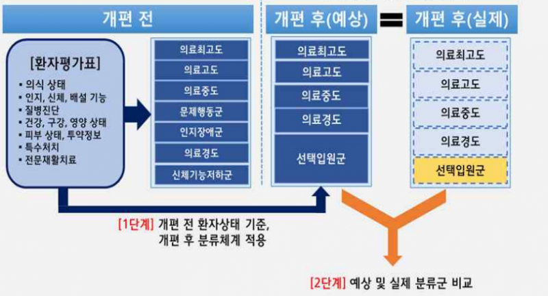 즉 실제로 요양병원을 이용하는 환자 가운데는 중증도가 낮은 환자가 많기 때문에 이들에게 적합한 수가 적용군을 설정하고 경증환자의 장기입원을 제한하자는 목적이었다.