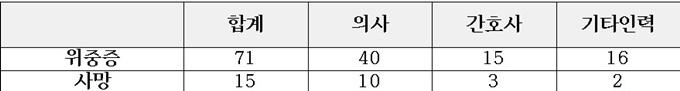고유량 산소요법, 인공호흡기, 에크모(ECMO·체외막산소공급), CRRT(지속적신대체요법) 등 격리치료가 필요한 위중증 환자는 의사 40명, 간호사 15명, 기타인력 16명 등이었다.