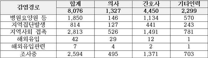 감염경로는 지역사회 접촉 2813명(의사 526명·간호사 1491명·기타인력 781명)이 가장 많았다.