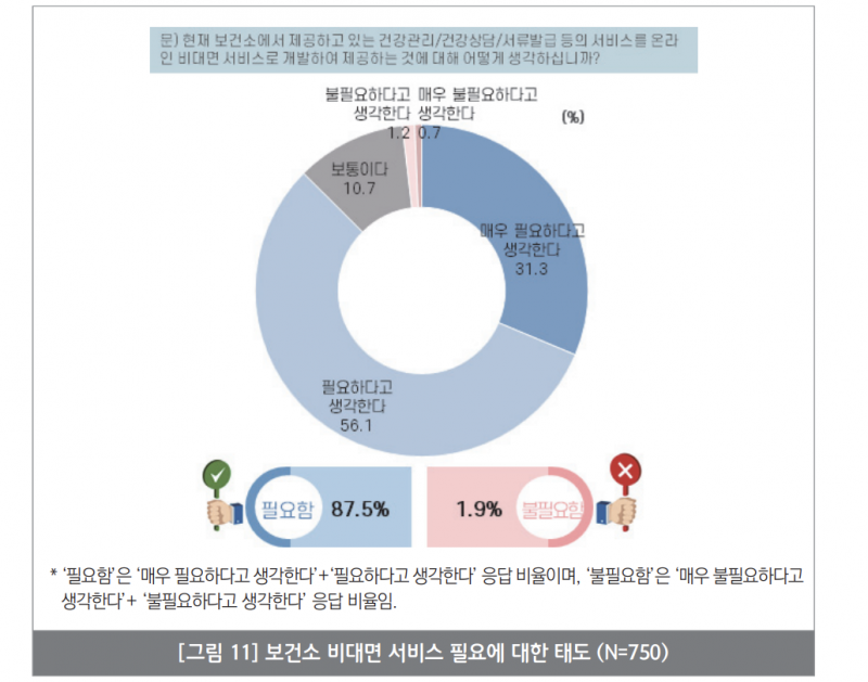 서울시에 거주하는 만 19세 이상 69세 이하 시민 750명을 대상으로 보건소 이용 현황에 관한 설문조사 결과, 보건소 비대면 서비스 제공 필요성을 묻는 질문에 87.5%가 '필요하다'고 응답했다.