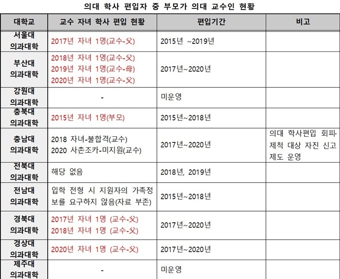 세부적으로 서울대 1명(부 1명), 부산대 3명(부 2명·모 1명), 충북대 1명(부모 1명), 경북대 2명(부 2명), 경상대 1명(부 1명) 등이었다. 해당 기간 동안 강원대와 제주대는 의대 학사편입 제도 자체를 운영하지 않았다.