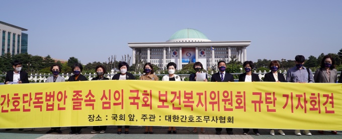 대한간호조무사협회(회장 곽지연, 이하 간무협)는 27일 국회 앞에서 기자회견을 갖고 "보건복지위원회 제1법안심사소위원회에서 ‘간호사단독법’이 통과될 경우 보건의료현장 간호조무사의 파업까지 불사하겠다"는 강경 입장을 천명했다.