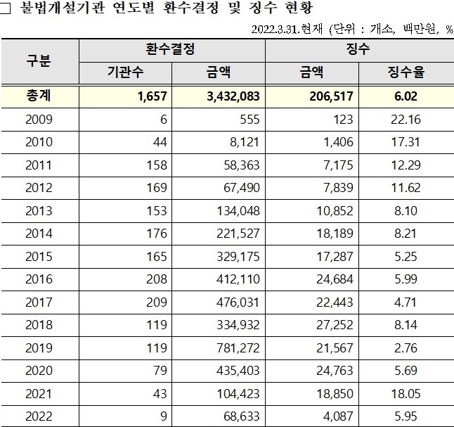 한편, 건보공단에 따르면 불법개설기관은 지속적으로 증가해 피해규모만 약 3조4000억원(올해 3월 기준)에 이르지만, 사무장 재산 은닉 등으로 징수율은 6.02%에 그치고 있다.