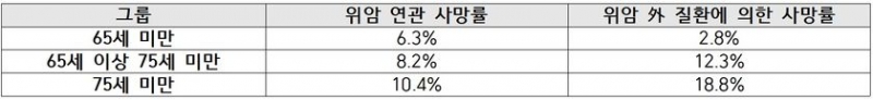 연구결과 위암환자 연령이 증가함에 따라 위암 연관 사망률은 6.3%(65세 미만)에서 10.4%(75세 이상)까지 지속적으로 높아졌다.
