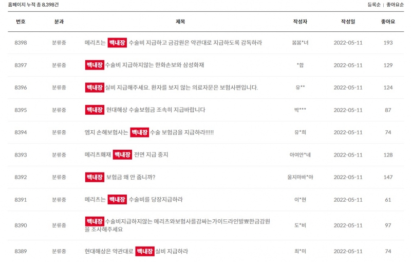 이달 11일자로 운영이 종료된 20대 대통령직 인수위원회 '국민이 당선인에게 바란다' 페이지에도 실손보험사로부터 백내장 수술 보험금을 지급받지 못했다고 호소하는 게시물이 8300건 이상 올라온 바 있다.