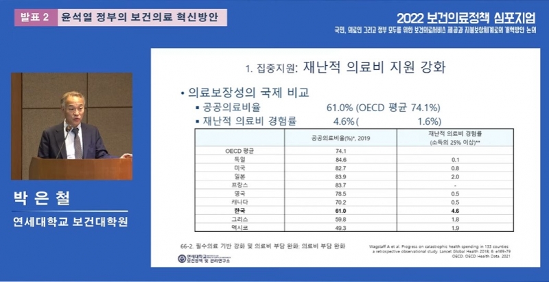 박 교수는 이날 “우리나라 보건의료는 변화해야 하고, 전환해야 하며, 혁신해야 한다”며 보편적 지원을 강화한 문재인 정부 넘어 재난적 의료비 지원을 강화해야 한다고 역설했다. 현재 6대 중증질환으로 제한하고 있는 의료진료비를 모든 질환으로 확대해야 한다는 주장이다.